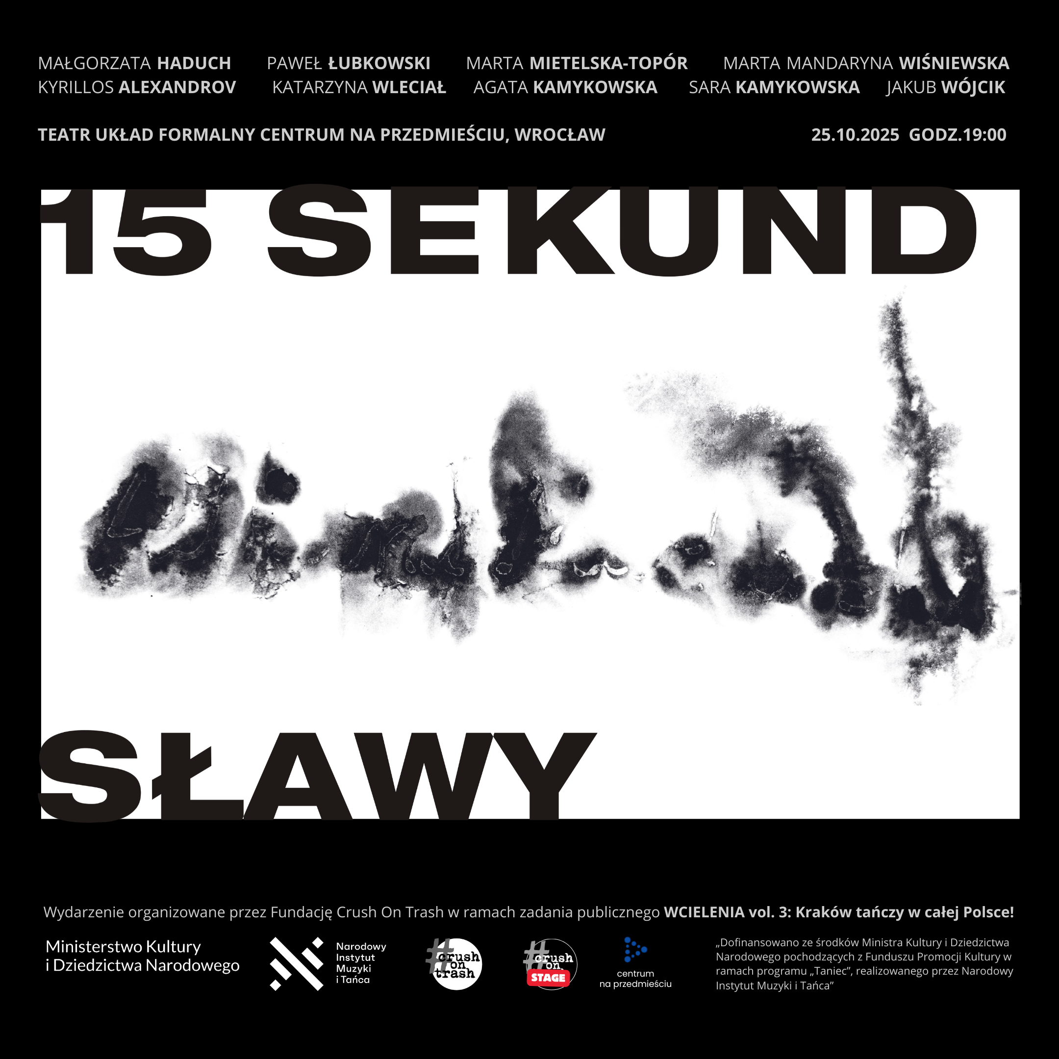 "15 sekund sławy" to przedstawienie, które zostało stworzone z myślą o sprzeciwie wobec natychmiastowości. W procesie twórczym interesowało mnie (Małgorzata Haduch) osiągnięcie radykalizmu w formie kompozycji tego spektaklu, podążaliśmy dwoma ścieżkami - poszukiwania własnej i intensywnej ekspresji ruchowej czy głosowej, mając w pamięci słowa Hijikaty "taniec-trucizna, którego jedna łyżeczka wystarczy by sparaliżować zmysły". Jakim językiem będziemy mówić ? – byle nie namaszczonym, nie napuszonym. Będziemy mówić językiem dzikiej świni.